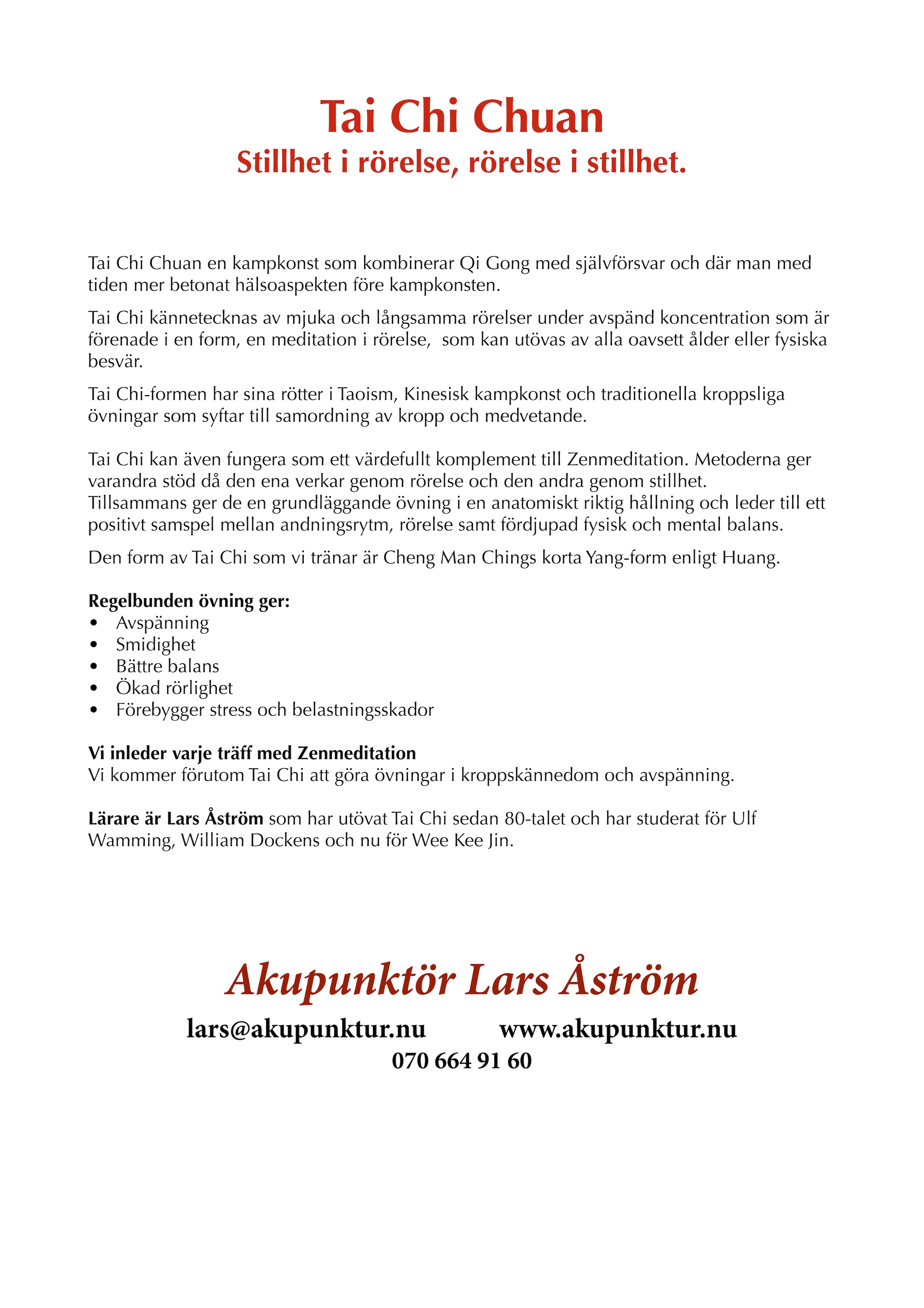 Thai Chi gör mig både lugn och stark, det var inte en kombination jag förväntade mig. Men passar mig så bra. Denna träning är så skön i kroppen, allt liksom hittar hem och jag sover som en stock. Jag har länge fått höra att jag har dålig hållning, behöver sträcka på mig och börja träna. Vet inte hur många gånger jag tränat, bål/rygg/rumpa och allt tänkbart men det fick inte den affekt jag hoppades. Nu med Thai Chi så hittar jag hållningen och tränar den på ett mjukt sätt som även går att ta med in i vardagen. Det är träning men känns inte som det. Har du liknande erfarenhet så testa! Anna 44 år